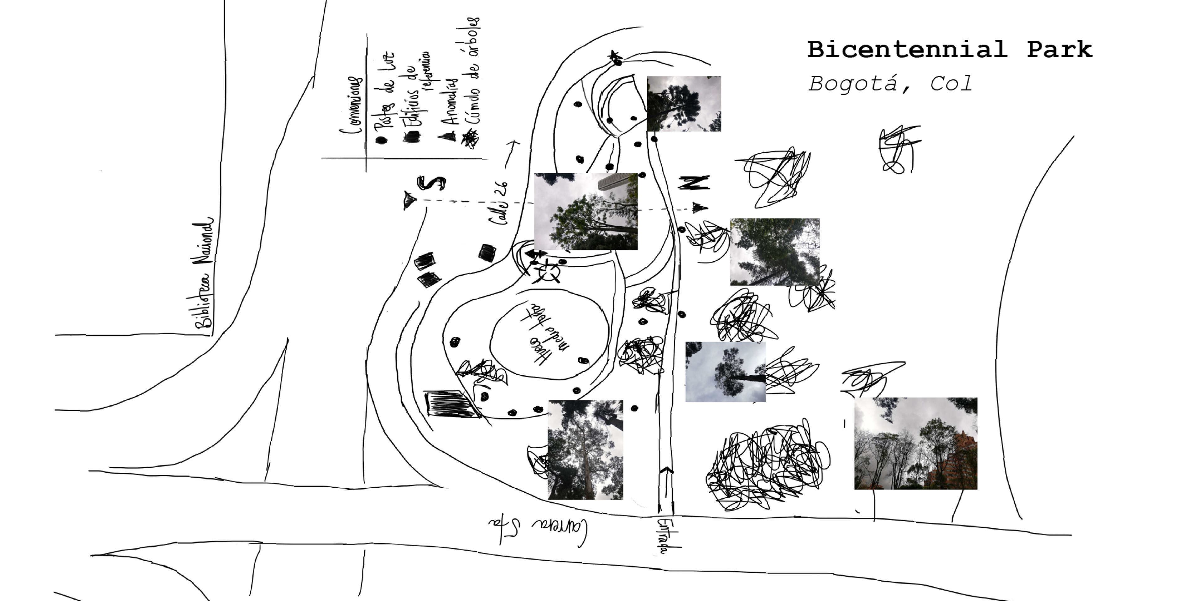 Critical cartography allows us to reclaim a degree of “control” over the perception of a territory and to assign new meaning to a place — whether from a personal or collective experience. Through observation, mindfulness, and focused attention, we created this subjective map within the territory of Parque de la Independencia in Bogotá, Colombia.